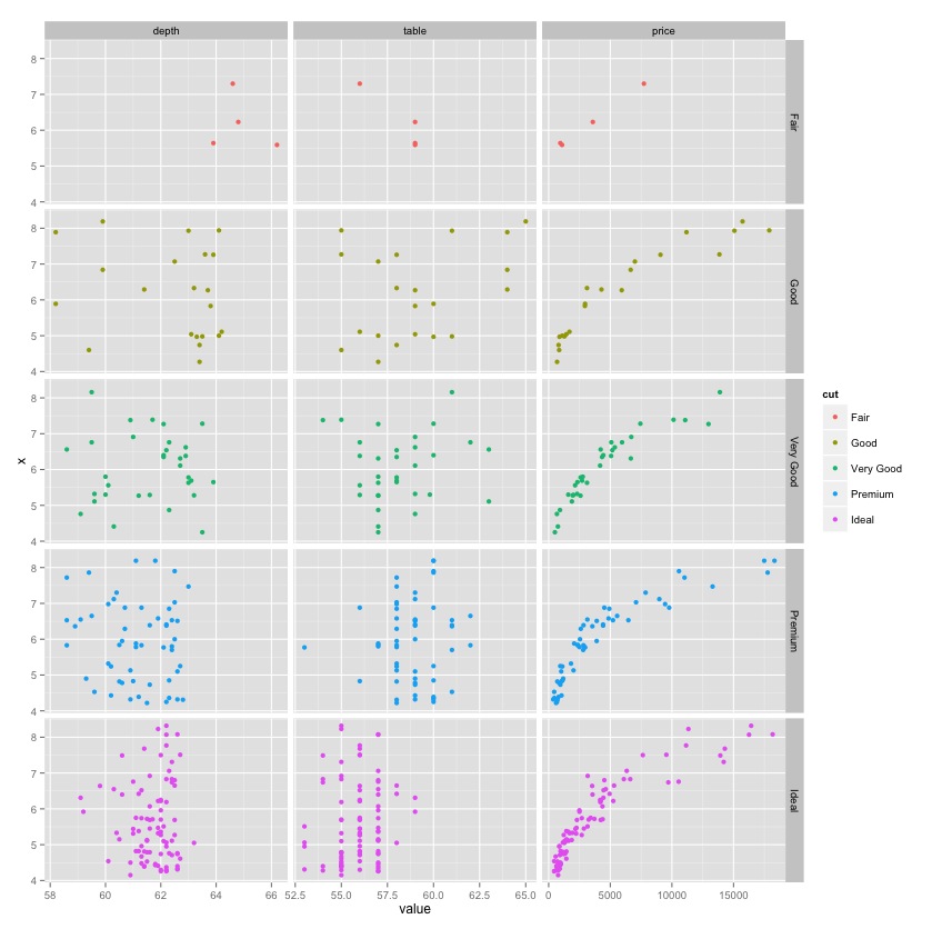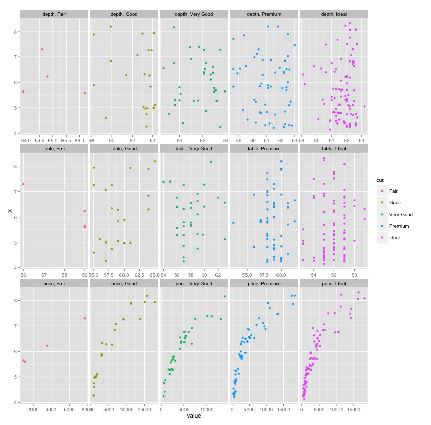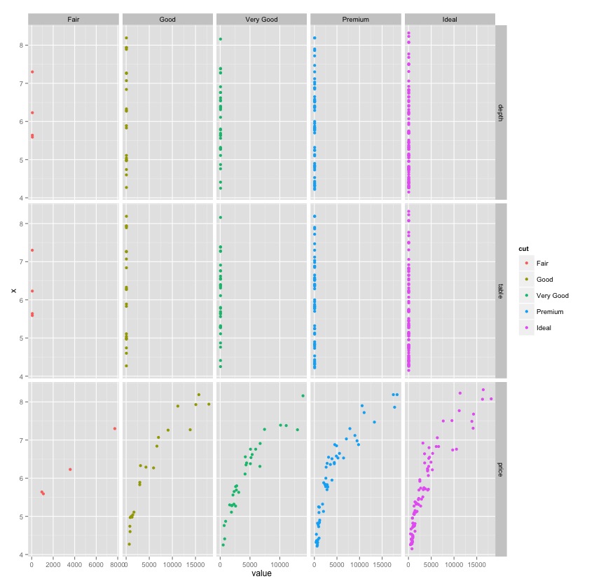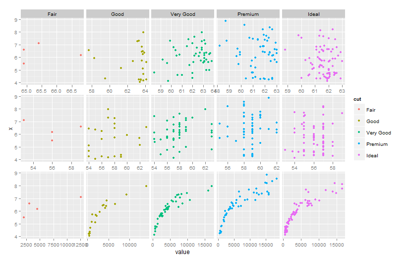 id.vars = c("cut","x"))这是我想要的地块安排(质量在栏和深度,表,价格作为行)