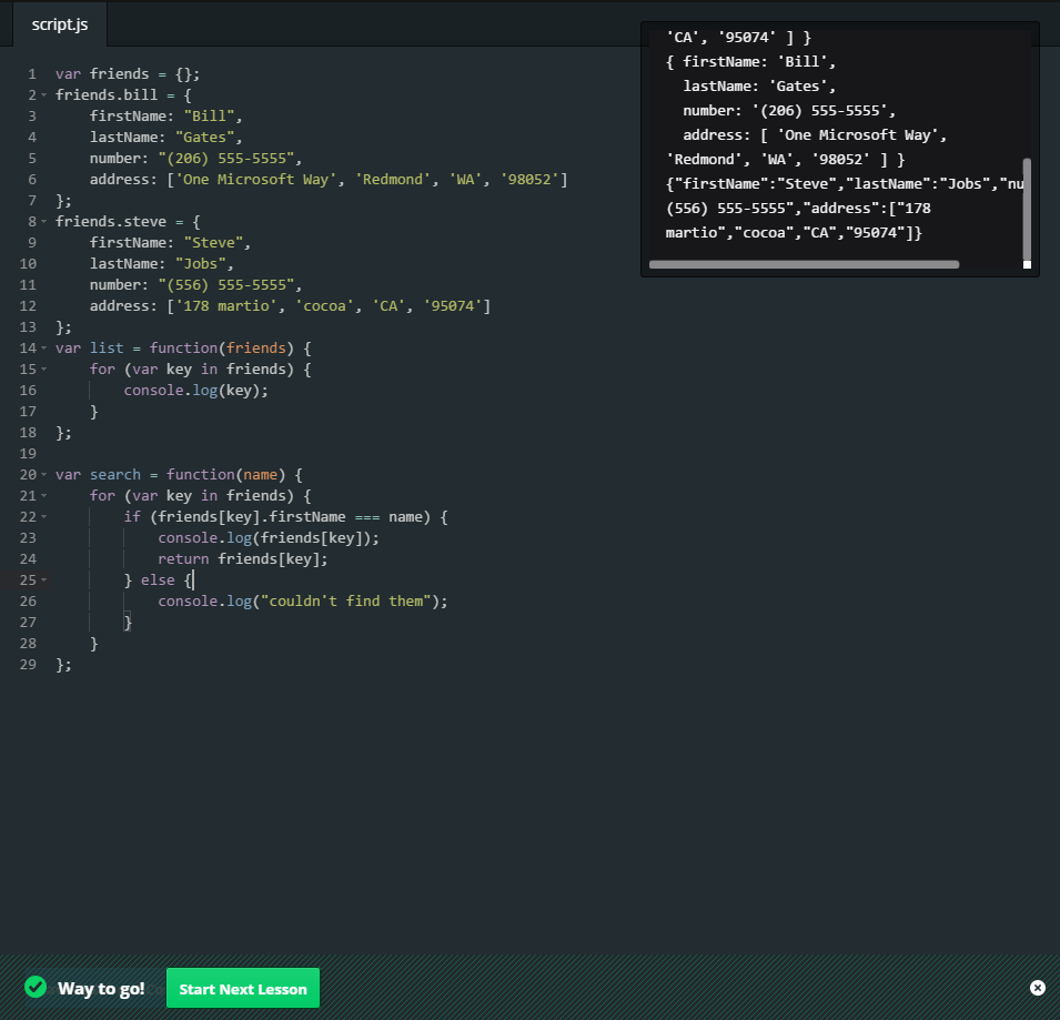 我正在做代码学院课程的“建立联系人名单”部分。这里怎么了?继续获取错误"Oops,再试一次。看起来您的搜索功能没有返回史蒂夫的联系人信息。“(http://www.codecademy.com/courses/javascript-beginner-en-3bmfN/0/7)