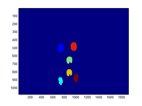 s = regionprops(im, 'PixelList');这将返回一个N元素结构,其中每个结构包含一个PixelList字段,该字段包含每个唯一对象的(x,y)坐标。在您的示例中,这将是一个M x 2矩阵,其中第一列是x或列坐标,第二列是y或行坐标。