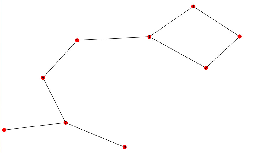 G.add_edges([(0,1), (1,2),(2,3),(3,0),(0,4),(4,5),(5,6),(6,7),(6,8)])从节点0到1,2,3返回到0有一个“循环路径”(抱歉,图中的节点标记以1而不是0开头)。