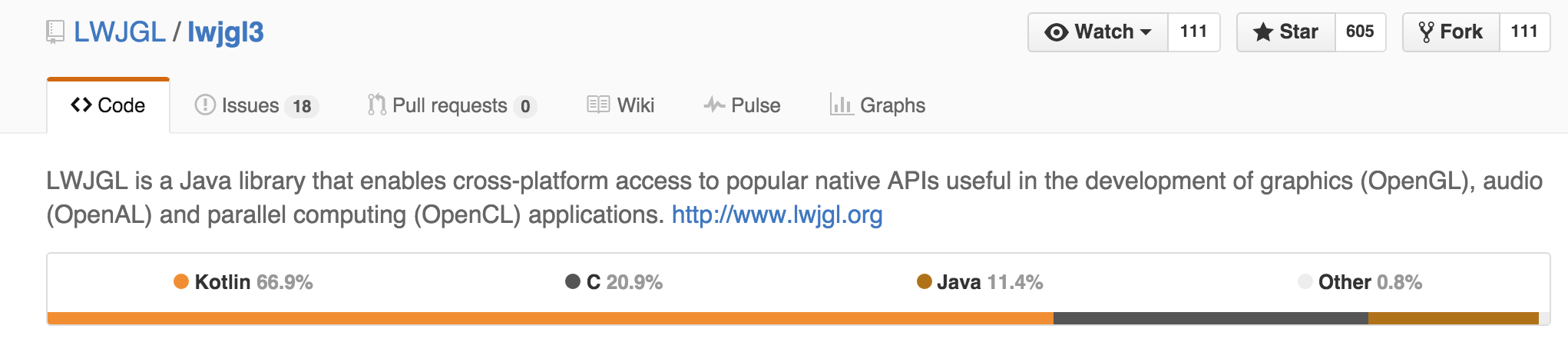 注意:游戏库LWJGL 3部分使用Kotlin,GitHub统计数据显示67.3%的代码是Kotlin (模板模块看起来大部分是Kotlin)。因此,询问与LWJGL合作的人会给你这个问题最好的答案,因为他们在这方面有很多经验。