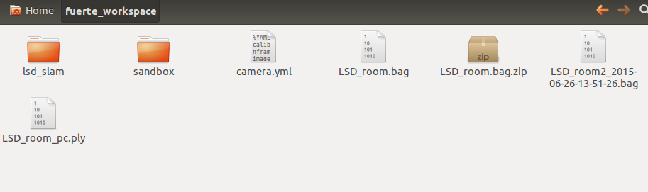 我用的是ubuntu 12.04。我从wiki页面安装了ROS。然后我安装lsd_slam代码表单这里。在lsd_slam文件夹下有一个自述文件。这些文件夹的视图如下: