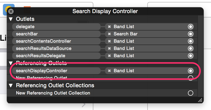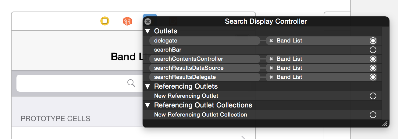 不知道为什么,但我注意到我的搜索栏/搜索控制器没有正确连接。我把它移走了,又加回去了,一切都正确地连接起来了。具体地说: