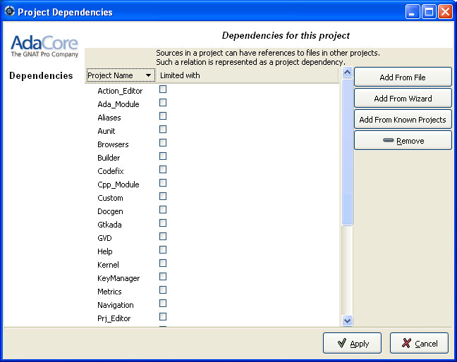 Adacore全球定位系统的文件在第6.9节中描述了Project>Dependencies,但是在Project>Dependencies的工具菜单中不存在这个编辑器,文档中说应该找到它。我在Properties表单的工具菜单中找不到它。
