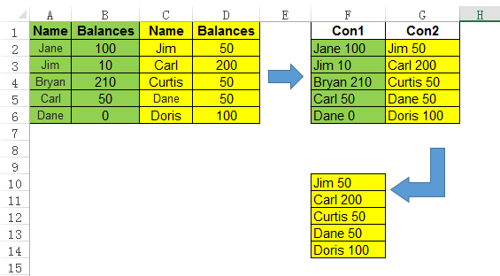 我想把A&C栏中的客户与B& D栏中的相应余额相匹配,A&B栏是我上个月的应收款项。C&D是这个月。我想比较一下同一行,并排的每个客户端。