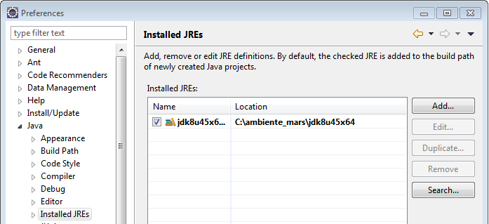 当我启动Eclipse并配置我的环境时,我开始像这样设置我的Installed JREs (就像我从Indigo开始做的那样):