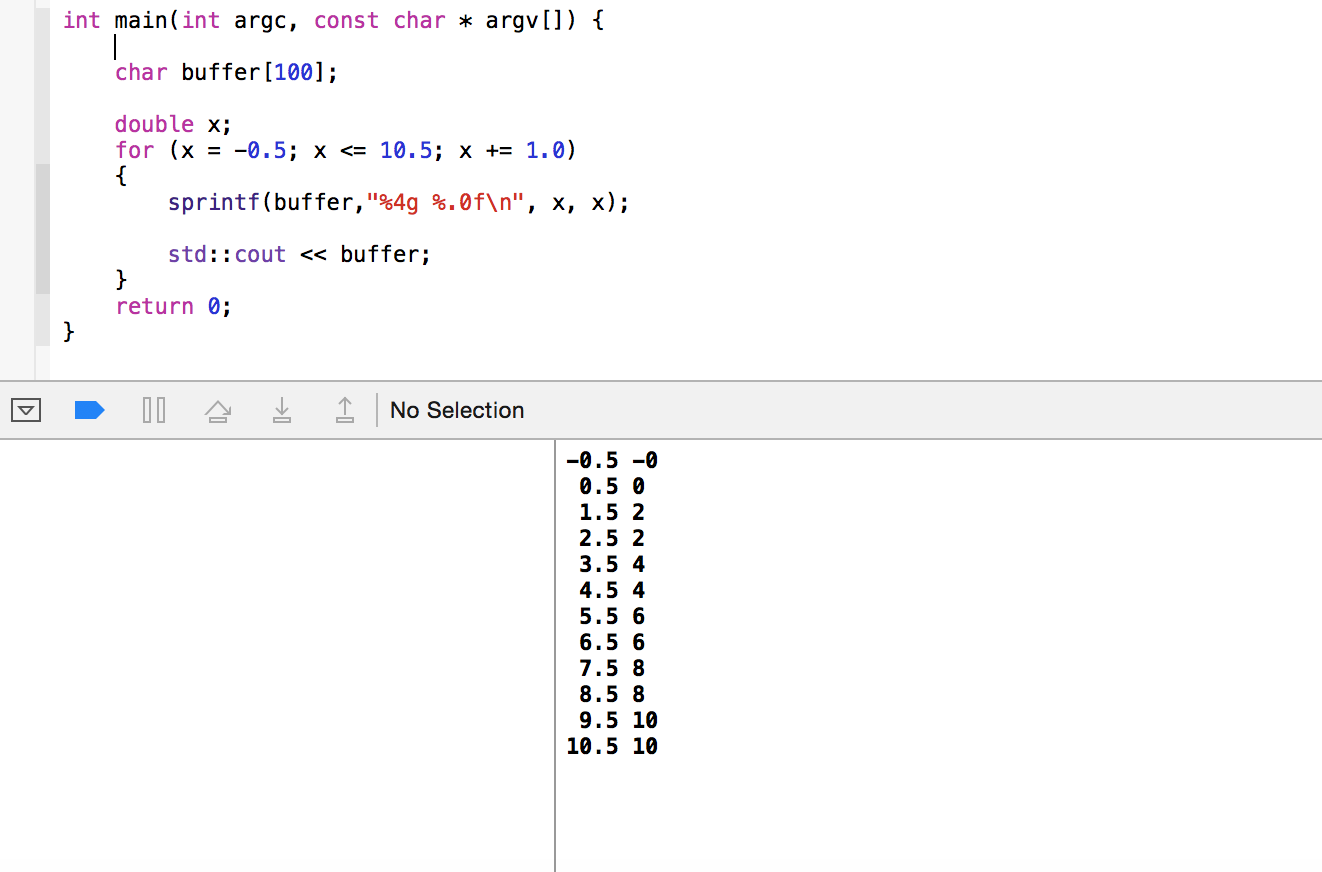 sprintf(buffer,"%4g %.0f\n", x, x);