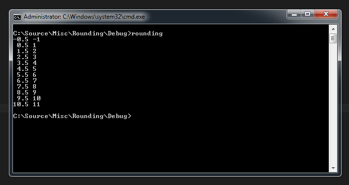 Visual编译器似乎执行从零到半圆,而GCC则执行圆平,也就是银行家的四舍五入。