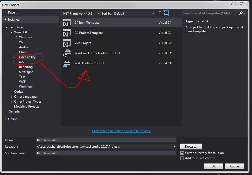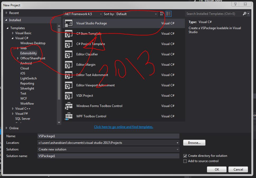 我已经在我的机器上安装了Visual Studio 2015 RC SDK。创建新项目时,我没有Visual Studio Package模板。这是Visual Studio 2015 RC的屏幕截图