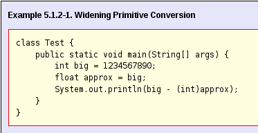 System.out.println(big - (int)approx); // what? (float -> int)在最后一行代码中,我认为正在缩小转换范围,对吗?如果我错了,请解释一下!提前谢谢。