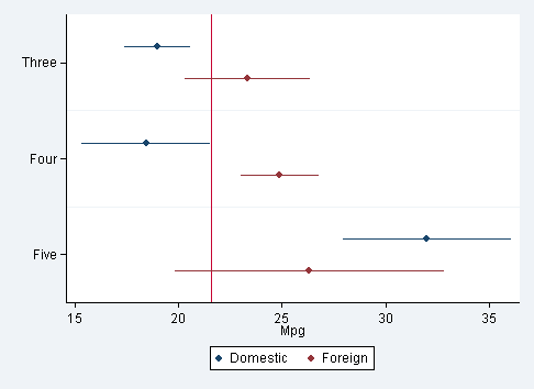 coefplot Domestic Foreign , xtitle(Mpg) xline(`r(mean)') ///