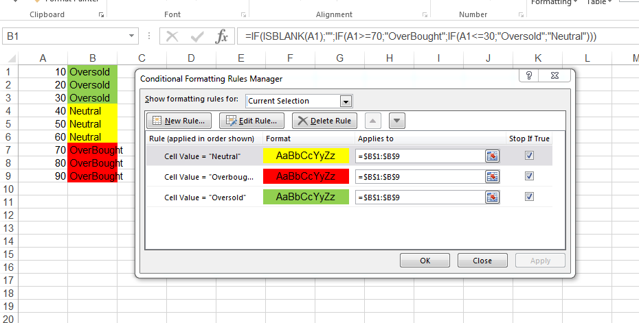 =IF(ISBLANK(BG7),"",IF(BG7>=70,"OverBought",IF(BG7<=30,"Oversold","Neutral")))公式有效,单元格显示正确的单词。