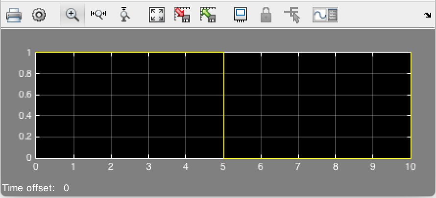 首先,我将模拟时间设置为10,并将脉冲发生器设置为Period = 10和Puls width = 5。范围的产出如预期的那样: