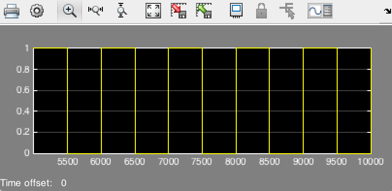 但是,当我尝试使用模拟时间为10,000,以及使用Period = 1,000和Puls width = 500的脉冲发生器时,我的范围似乎是错误的:
