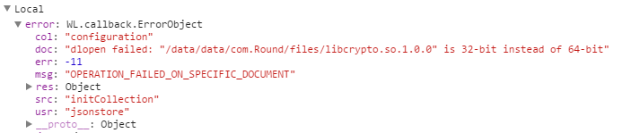 我试图让JSONStore在联想A7000-a上的MobileFirst 7应用程序中工作。但是JSONStore在初始化时会抛出错误。然而,在我的LG P880上,它工作得很好。以下是init的代码: