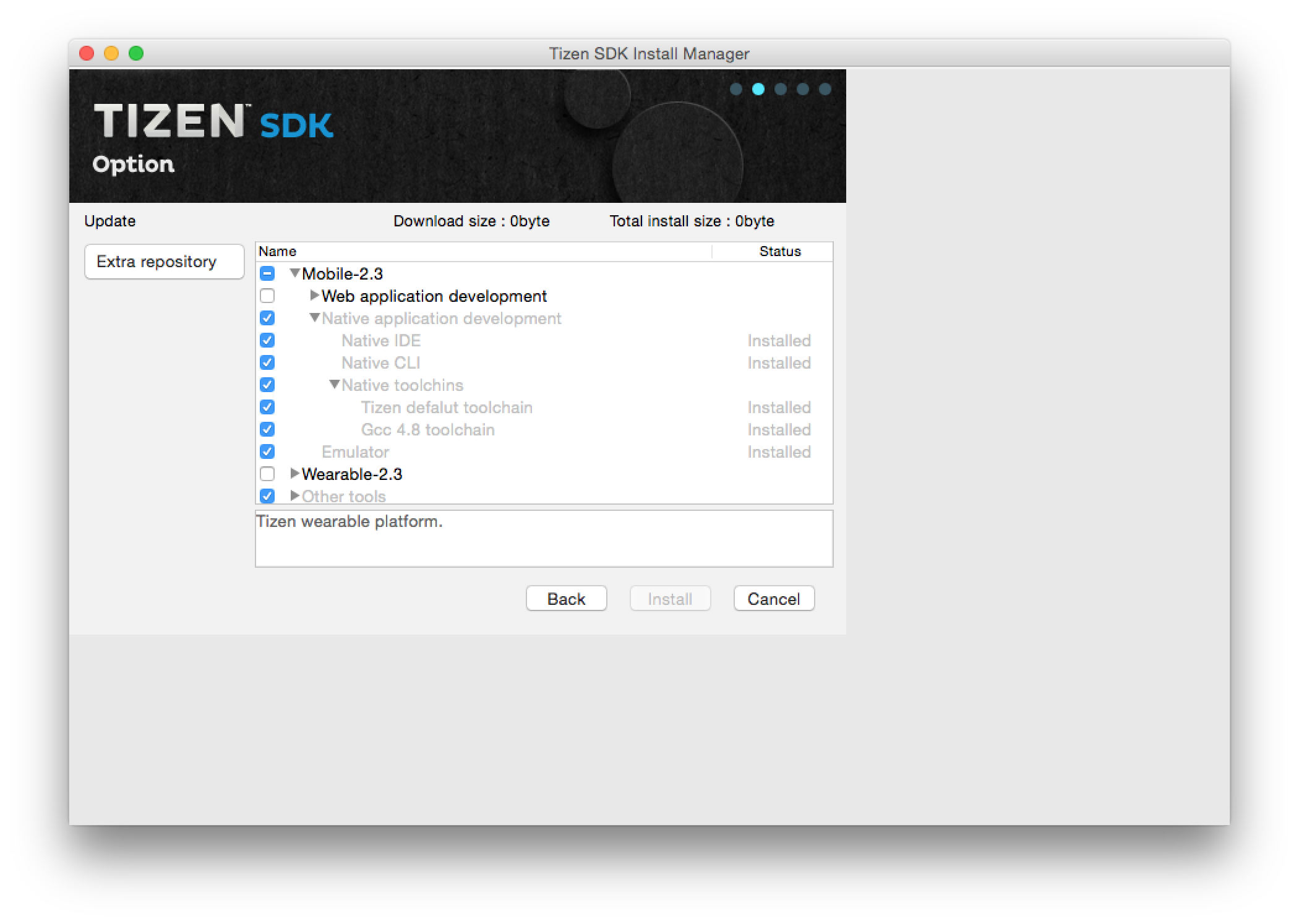 我下载了Tizen 管理器,并安装了Tizen用于本地应用程序开发,如下所示。