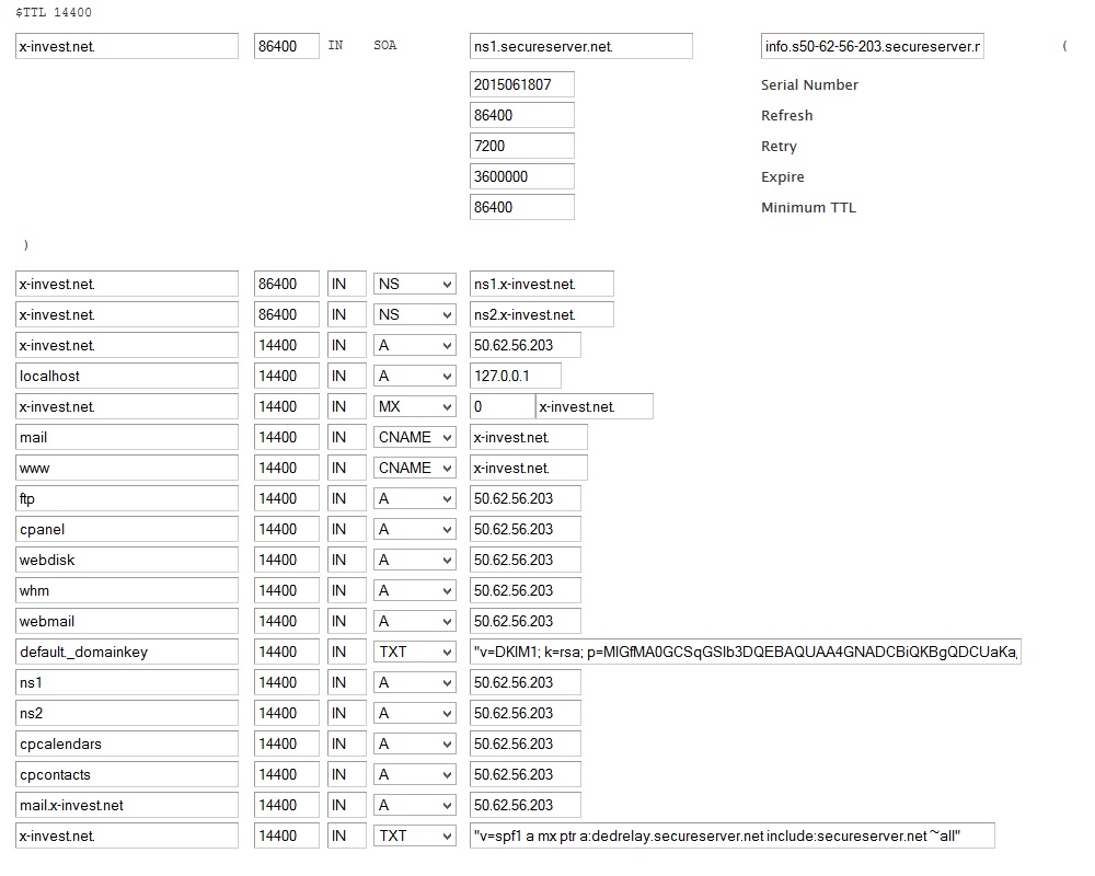 x-invest.net. 86400 IN SOA ns1.secureserver.net. info.s50-62-56-203.secureserver.net. 2015061806 86400 7200 3600000 86400这意味着您列出的作为域权限的服务器与internet所说的权限不匹配。