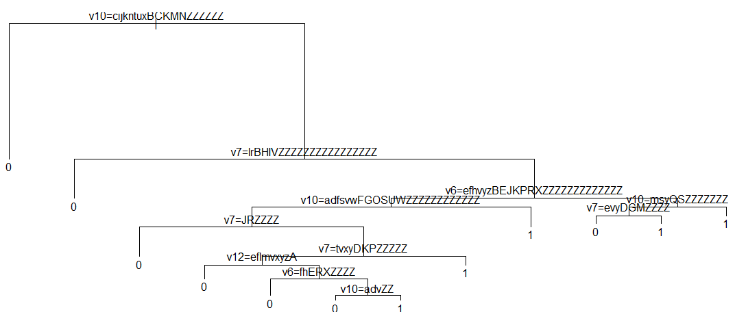 我试图在一个包含26个变量的数据集上运行一个决策树( RPart in R ),将结果分类为0或1。该模型的准确率为81%,当我继续绘制该树时,我得到了非常混乱的变量分裂值。例: v10包含一些国家的列表,比如美国、英国、印度等,但是这里的情节显示为一些荒谬的价值。v7这里有一个URL列表,v12在我的数据集中有一些定量的数字,但是树值看起来很糟糕。
