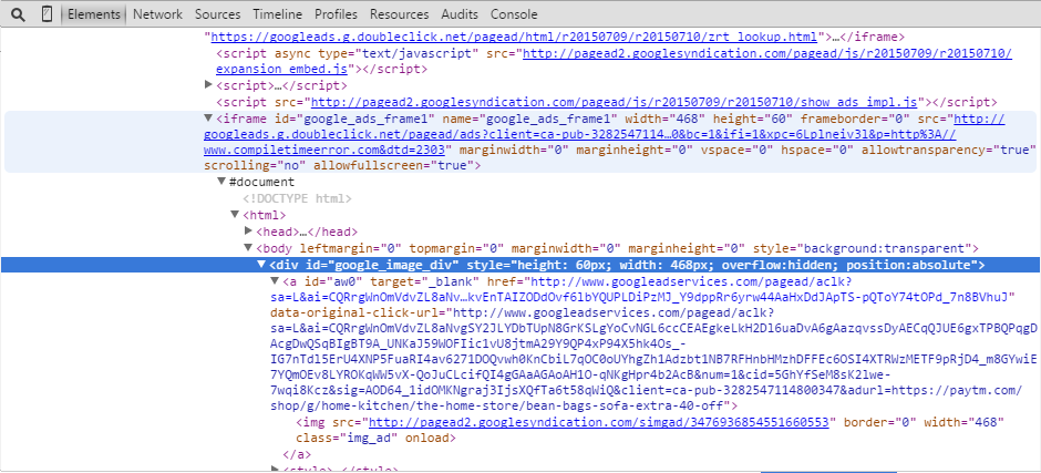 我正在尝试刮一个网站,并希望从谷歌AdSense获得网址和图片。但我似乎没有得到谷歌广告的任何细节。