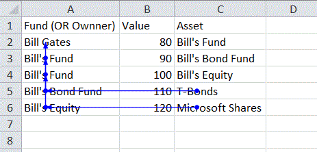 你为什么要那样做?好-选择包含比尔盖茨的单元格,转到公式选项卡,并反复调用Trace Precedents。你应该看到: