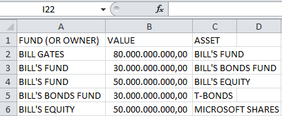 假设比尔盖茨( Bill )拥有一只基金,而该基金又拥有微软股票。在金融市场上,这是非常普遍的,这可能会更进一步(x拥有y,拥有z,拥有.)。问题是,如何递归地从最后一个节点检索数据到第一个节点?也就是说,如何知道微软比尔盖茨拥有多少股份?在SQL中,您可以使用JOIN,然后尝试在它之后进行一些黑客攻击,但即使这样,它也只能表明Bill拥有一只基金。最后一个连接,即票据基金拥有微软股票的一只基金不会连接(它会显示y属于x,但这个信息不会连接到y属于z)。那么,在excel中解决这个问题的最佳方法是什么?我完全接受类似这样的建议:“最好将其转换为csv,然后尝试这个建议的SQL命令”。下面是一个更好地理解问题的图表。