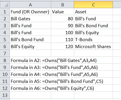 (显然-只输入A2-A6中的公式- A8-A12中的案文只是我的评注)。要获得这些信息,循环遍历A列--通过扫描到C列查看他们拥有什么--如果C列中的字符串也在A列中--将所有A列(但不包括C列)引用该资产作为参数到Owns()。这适用于A栏中的前三个条目,如果资产仅在C列中--将该行的引用放在C列中。这适用于A中的最后两个条目。