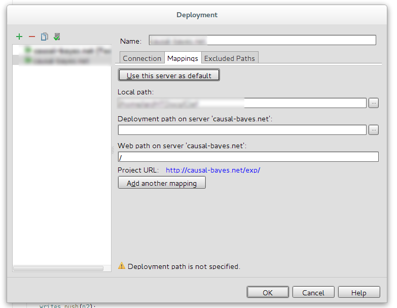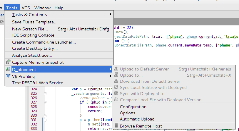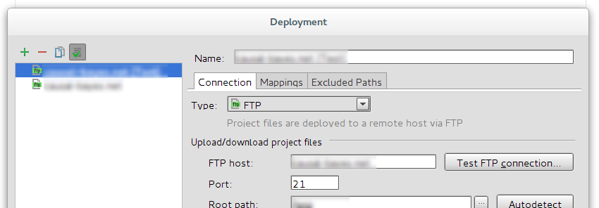 我正在使用Webstorm中的ftp客户端。一个ftp服务器被正确设置,我可以在“远程主机”工具窗口中浏览它。另外,ftp服务器被设置为默认设置: