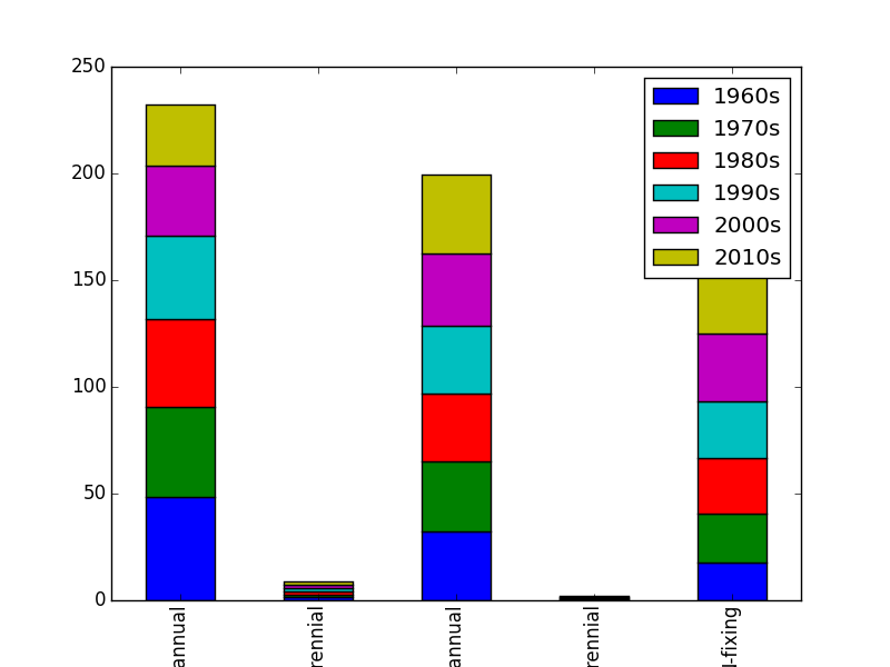 out_dec_df.plot(kind='bar',stacked=True)然而,我希望x-axis是‘1960年代’,‘1970年代’.‘2010年代’和堆叠的条形图是由功能性作物类型组成的。我该怎么做?