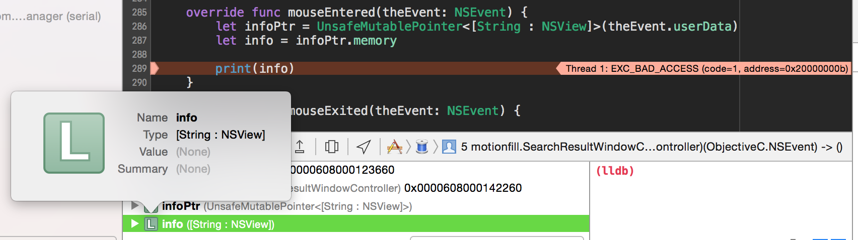 我正在重写NSResponder的mouseEntered(theEvent: NSEvent)方法,并希望检索在Swift中创建NSTrackingArea时设置的值。我使用这构造函数创建NSTrackingArea,并将以下对象作为userInfo传递。
