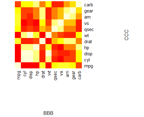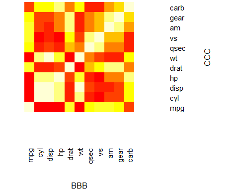 heatmap(corr_cars, Rowv=NA, Colv=NA, scale="none", xlab= "BBB", ylab= "CCC",