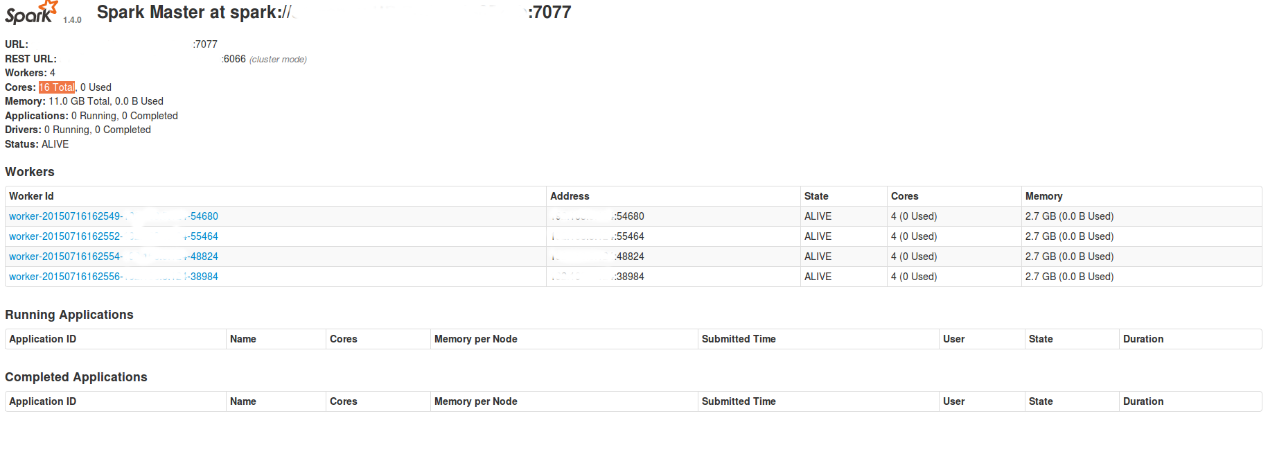 这些数字反映了集群中的资源总量。在这里,如果我们计算,你有4 * 4 cpus = 16 cpus,和4 * 2.7 GB ~= 11 GB的内存。