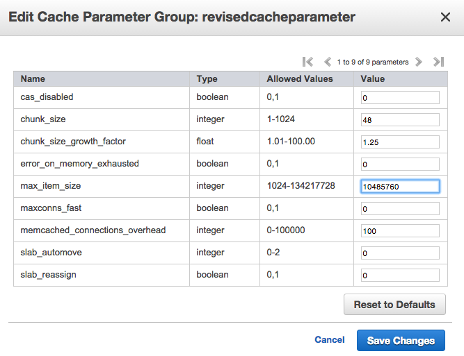 我猜这是因为memcached项的大小限制,它的上限是1MB。如何在AWS弹性缓存中将此项限制提高到5-6MB?