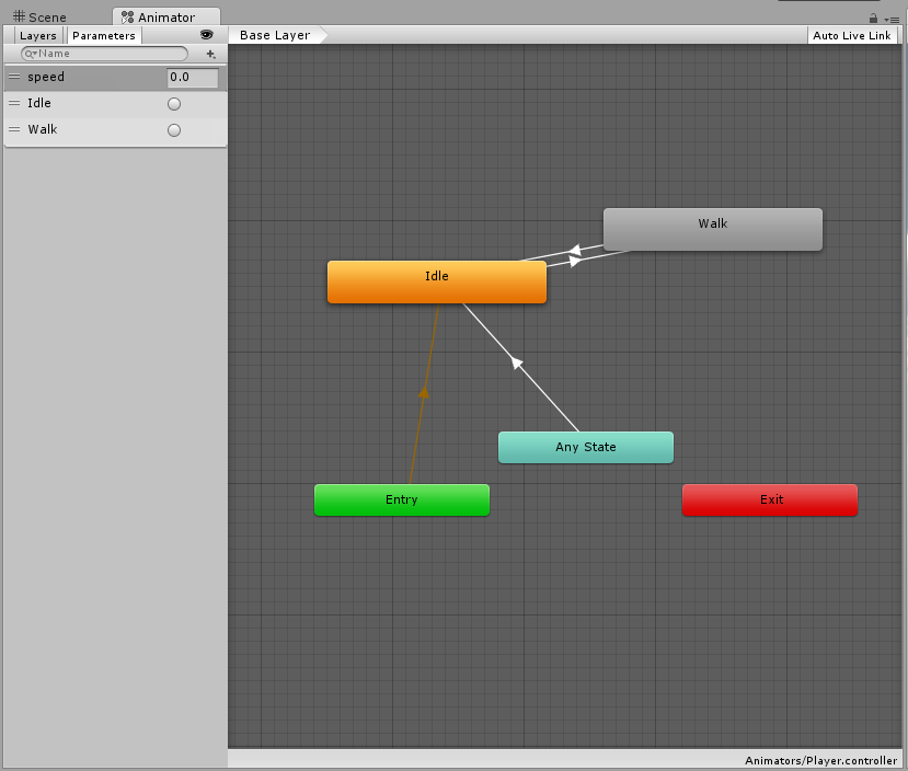 我创建了一个Animator Controller (称为Player),并将其分配给我的类人化身的Animator字段,以及具有适当转换的简单动画状态。请看两张附呈的图片。