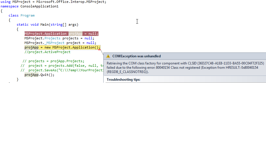 我需要使用Visual的Microsoft.Office.Interop.MSProject.dll在Project上工作。使用gacutil.exe,我已经注册了Microsoft.Office.Interop.MSProject.dll,并且在文件夹“C:\Windows\程序集”中有MSProject.dll的条目,其处理器体系结构为MSIL。我已经创建了Console Application,当我尝试创建Application实例时,它会给出错误:类未注册-HRESULT: 0x80040154异常。如图像所示。