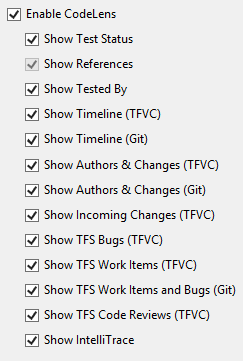 我安装了Visual 2015 Enterprise,只看到代码镜头中的“引用”。我们使用TFS进行源代码管理。我希望看到TFS提供相关的提交。基于本文,我在选项中启用了所有选项: