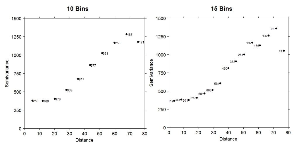 除了玩cutoff距离之外,还要注意在半方差图上支持每个bin的np (点对)。例如,使用您更新的proj4string信息,我尝试了cutoff=80和width=80/10 (10个桶而不是15个)来查看半变函数形状是如何变化的。当点对存在时,从15箱减少到10桶并不会改变,只会增加每个bin所代表的距离。而且,这种方法并不一定是您应该使用的方法,但它是一个示例,说明了如何为更平滑的样本半变量函数更改回收箱(但更平滑并不意味着更好)。