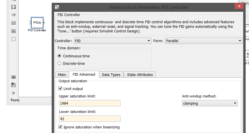在保存端,使用PID控制器块的饱和选项,并在需要时包括一个anti-wind-up method。