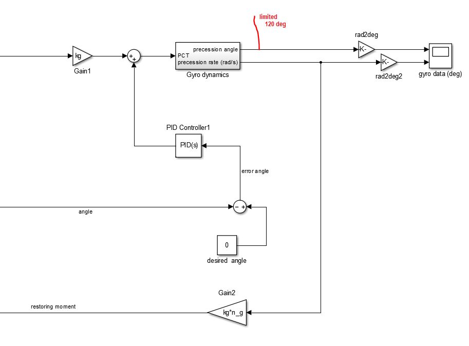 在理想情况下,采用PID控制器控制陀螺角的转矩控制,作为误差监测phi和0的误差。这一切都实现如下所示的图像,工作像一个魅力,但现在有一个限制因素:最大进动(陀螺仪)角度限制在150度.目前,没有限制,这个最大的陀螺角度大概是1500度,所以这是个问题。