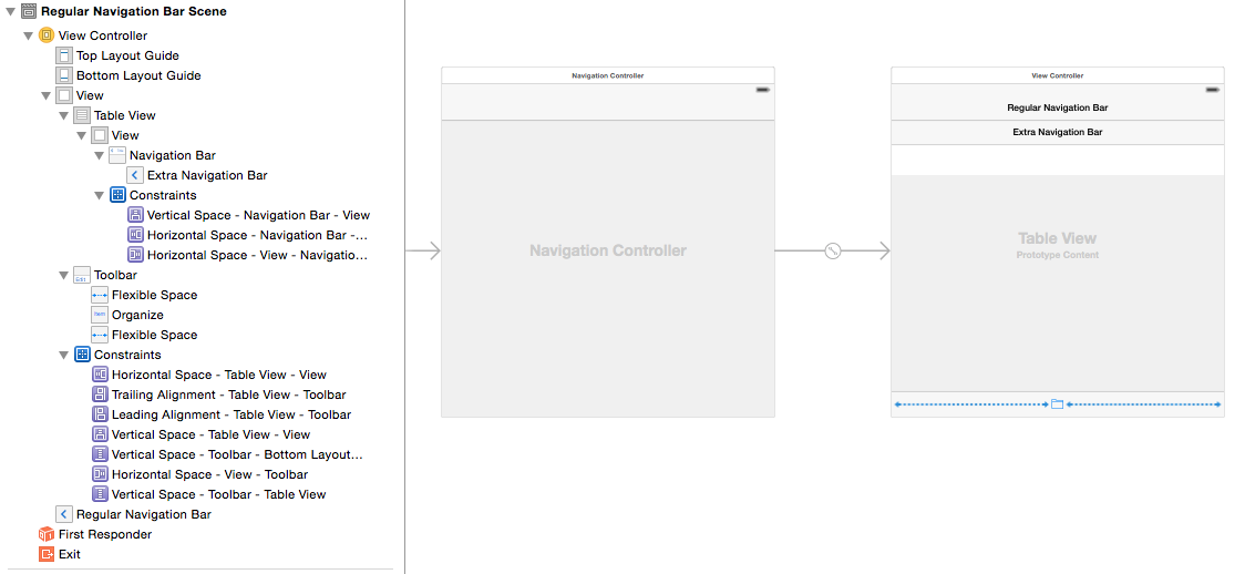 似乎你在汽车布局上有很多问题。添加一个常规的UIView作为tableHeaderView,将您的navigationBarThere放置到建议的约束中。