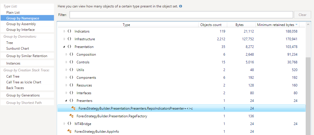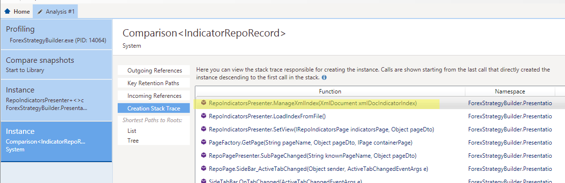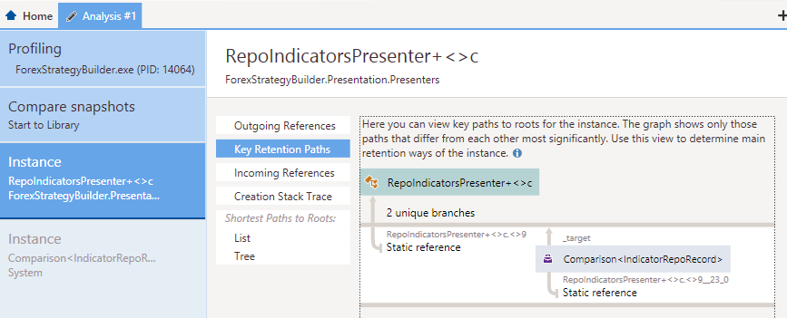 你看到的不是记忆泄露。这只是编译器将Comparison<IndicatorPropReport>缓存为调用站点上的static委托的方式,从而省去了为每次调用创建一个实例的需要。