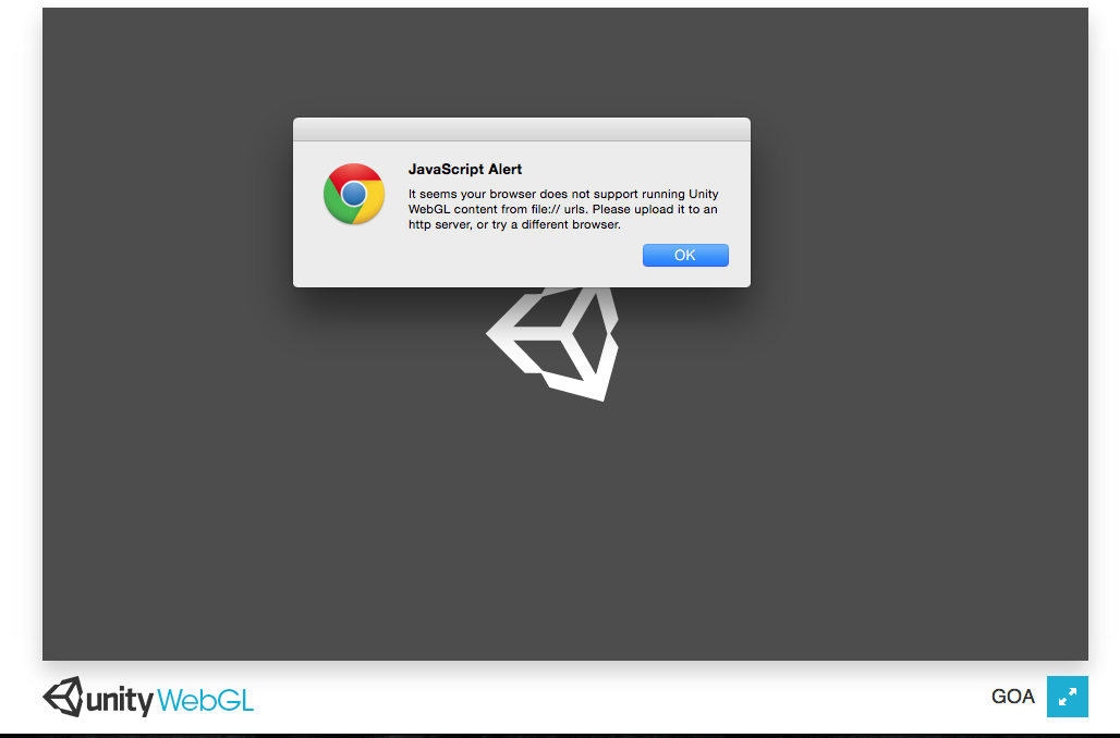 错误消息或多或少是不言自明的: Chrome不支持在从磁盘上的本地文件运行时运行Unity,因为Chrome安全。这不是一个真正的问题,因为在生产中,它总是从webserver运行(http://). )。
