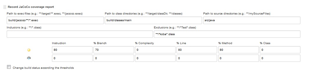 然后,确保在Jenkins的Jacoco插件中提到的值如下所示。注意:源代码不应包含任何测试(单元/非单元测试源)文件夹。