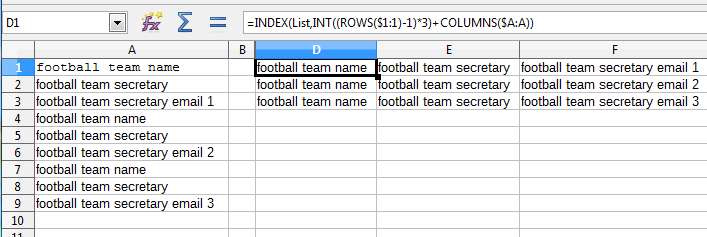 =INDEX(List,INT((ROWS($1:1)-1)*3)+COLUMNS($A:A))向右填充三列,然后选择行并按需要填充。