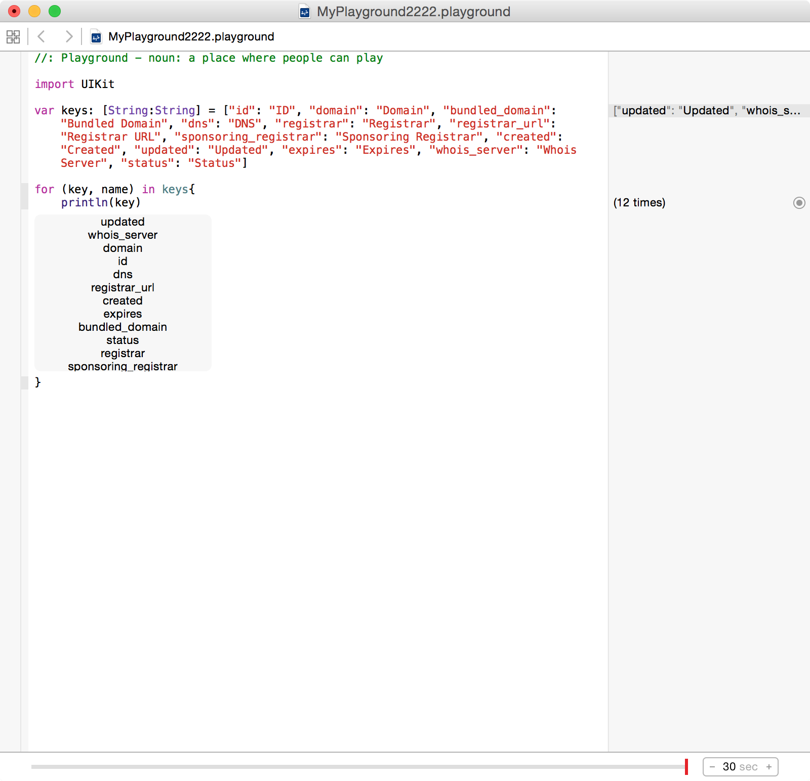 var keys: [String:String] = ["id": "ID", "domain": "Domain", "bundled_domain": "Bundled Domain", "dns": "DNS", "registrar": "Registrar", "registrar_url": "Registrar URL", "sponsoring_registrar": "Sponsoring Registrar", "created": "Created", "updated": "Updated", "expires": "Expires", "whois_server": "Whois Server", "status": "Status"]