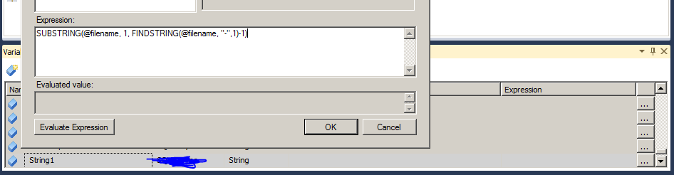 @String3 = SUBSTRING(@filename, FINDSTRING(@filename, "-",2)+1, FINDSTRING(@filename, "-",1)-1)然后,您可以将这些组合成另一个变量,比如@finalstring。