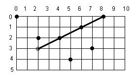 “游客的地图上有一张can维的地图,地图上有k个城市(k<=2000)。城市的坐标有那个形式(林、科尔) (lin<=M和col<=N)。我们也知道游客的坐标。游客决定沿着一定的方向走,在地图的边缘停下来。但他想沿着这个方向走,这样他就能走到尽可能多的城市。你必须计算出他能去的城市的最大数量。” M,N <= 1000 K<=2000 例如5、10 (M和N) 3 2(游客坐标) 7 (k =城市数目) 0(城市坐标) 0 8 1 6 2 2 2 4 3 7 4 5 答:3