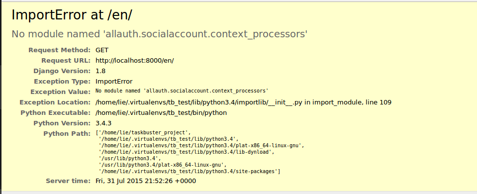 我已经在我使用的两个虚拟环境中安装了django-allauth .22,但是我仍然收到了这个错误。即使allauth.account.context_processors.account被注释掉,当我取消评论时,我也会收到同样的错误。这是来自这教程的。我已经看到了有关这方面的问题,但它们都是通过简单地添加逗号或安装django-allauth来修复的。有什么想法吗?