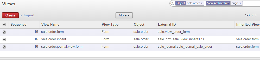 这可能发生在您已经修改了任何视图时,该视图添加了一些字段基don原产地,或者从原始记录中删除了源文件字段。在数据库中,sale.order模型共有三个视图,它们正在更改或添加原始视图,如下图所示: