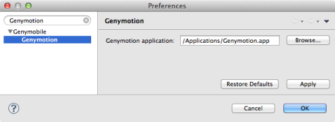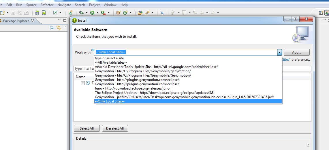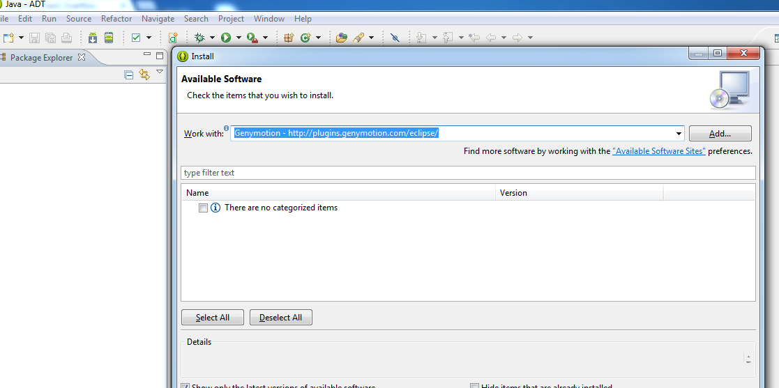 Genymotion下载并安装在我的笔记本电脑上,Genymotion的模拟器在Genymotion应用程序中正常工作,但是当我从Eclipse>Help>Add新软件在Eclipse中安装genymotion时,我添加了这个插件,但是它不能显示Eclipse..please中的Eclipse>Help>Add-任何人事先帮助me..Thanks --我找不到Genymotion,它说在Eclipse中没有分类项