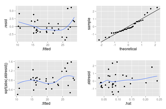 解决方案之一是使用ggplot2::fortify。下面是您可以在其帮助页?fortify上找到的代码。我正在添加gridExtra,把这4个情节放在一起。